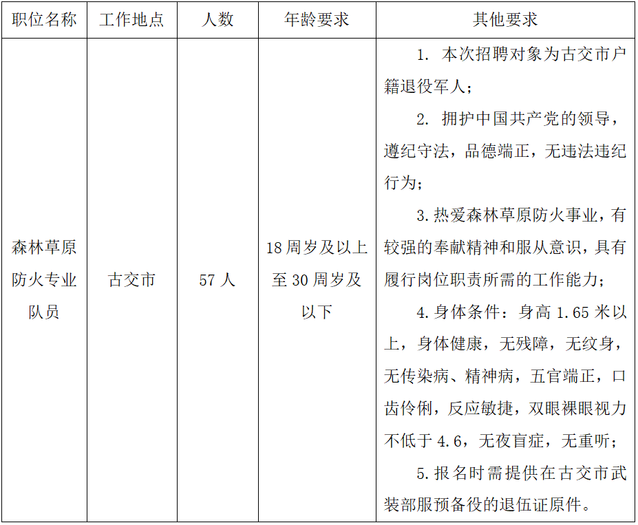 注:由于招聘的57名森林草原防火專業(yè)隊員從事高危行業(yè)的特殊性,要求招聘對象為男性。